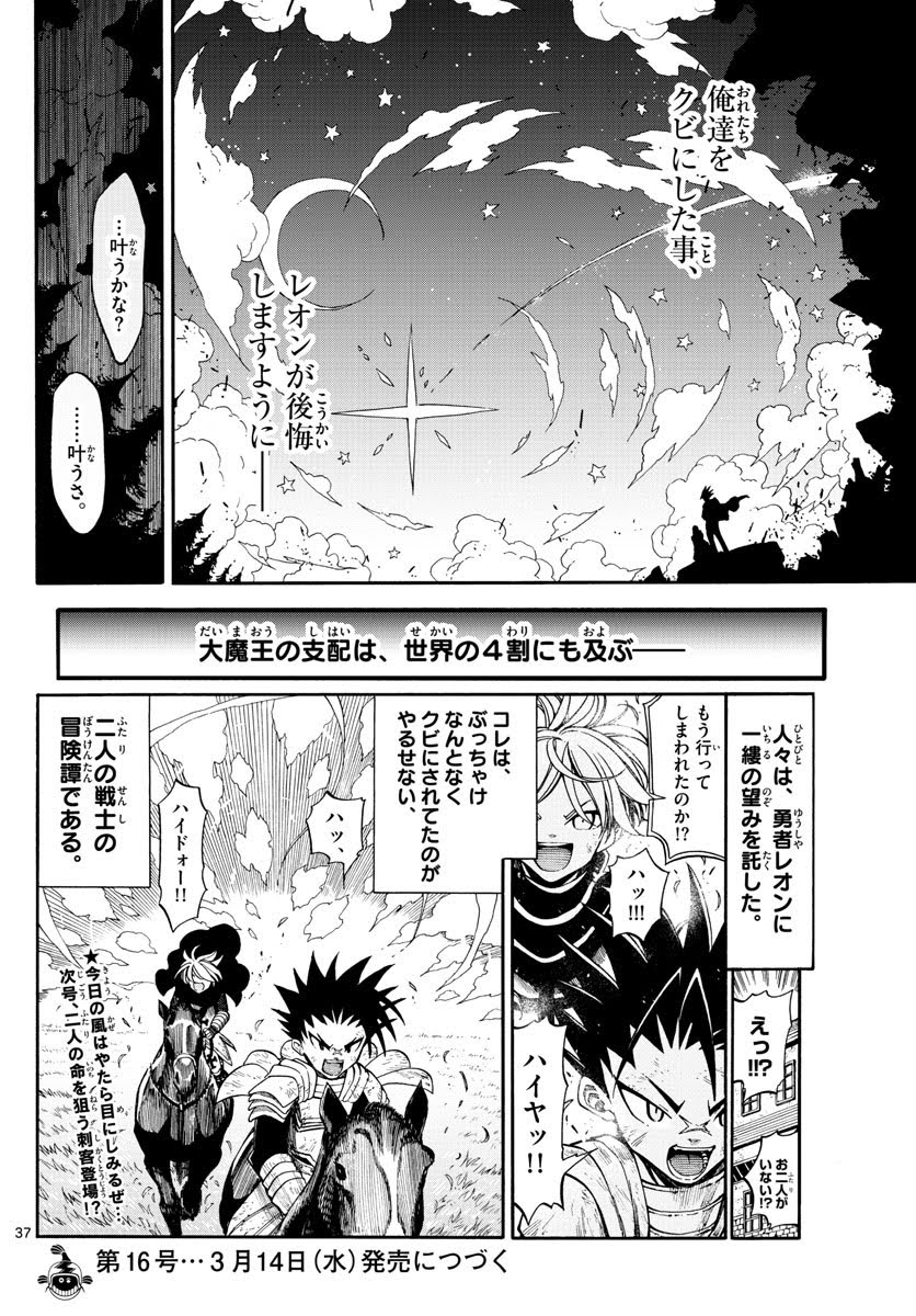 The castle itself has been overrun with monsters who eat humans for fun, even when they're sick and weak as the person there notes on the left. At first the monsters seem dismayed by this information and draw back, but then they say that sick humans actually taste awesome, and prepare to dive in when they're all mercilessly killed. Gotta say this kind of ultraviolence isn't the type I expeceted to see in a magazine like Sunday --though it is about right for shounen, I suppose. Just, up until a few months ago, this was the "heroine" magazine, y'know? That being said, I am glad to have guys like Yagyuu coming in to bend that expectation over.